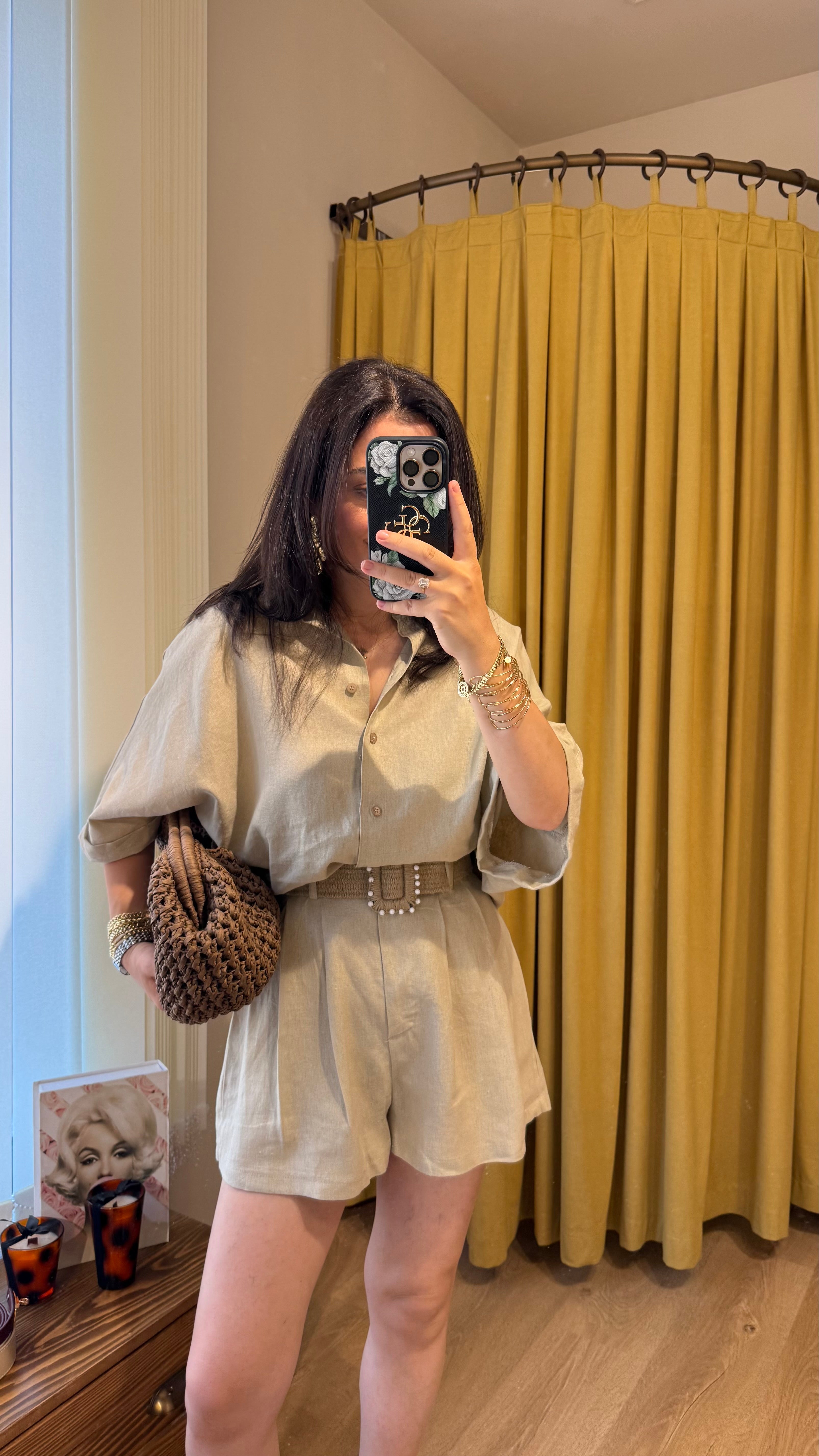 BEJ KETEN KEMERLİ GÖMLEK ŞORT TAKIM