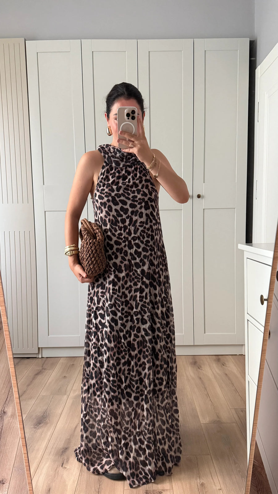 HALTER YAKA ASTARLI LEOPAR UZUN ELBİSE