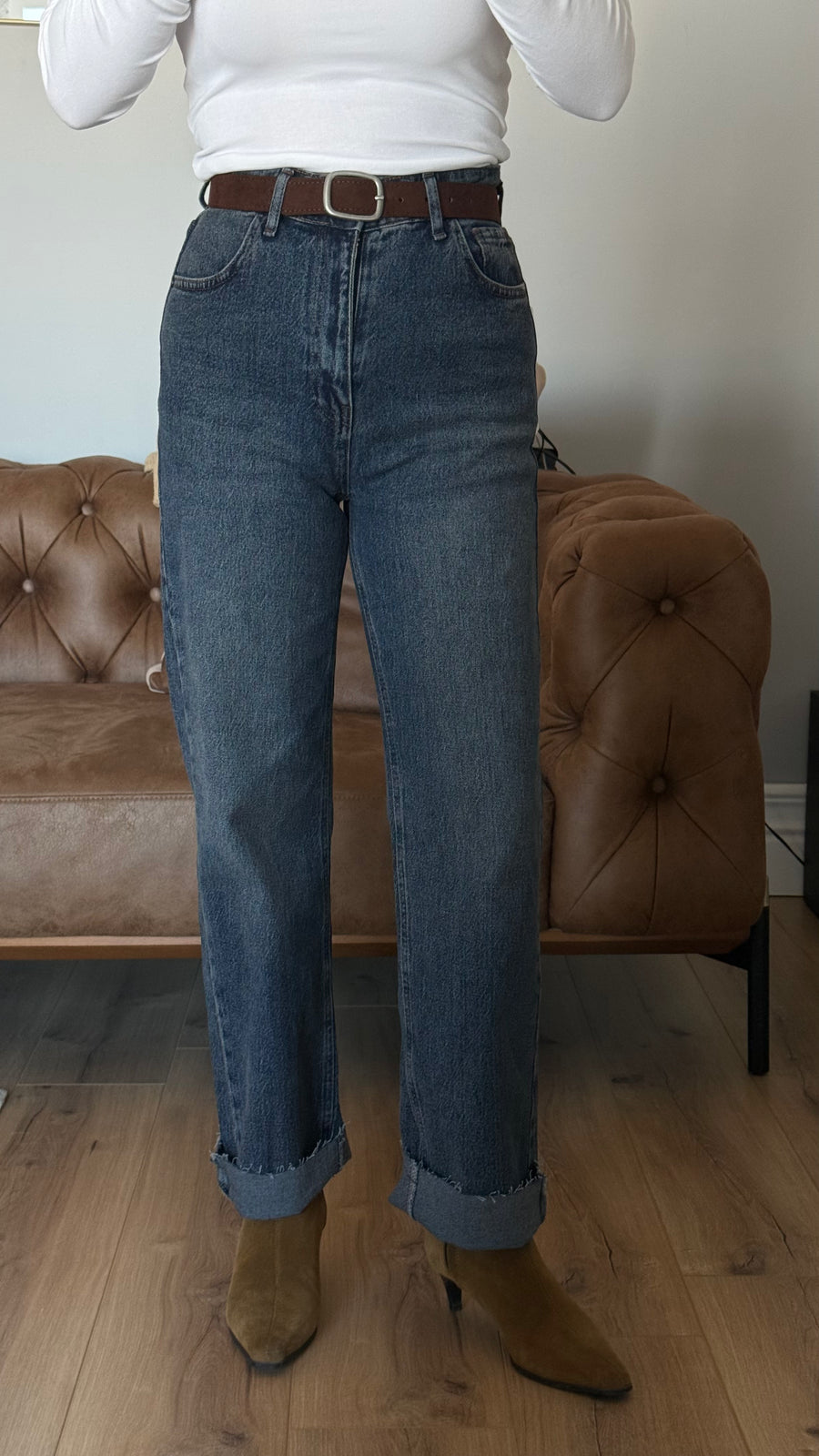KOYU LACİVERT ESKİTME ACI KAHVE KEMERLİ JEAN