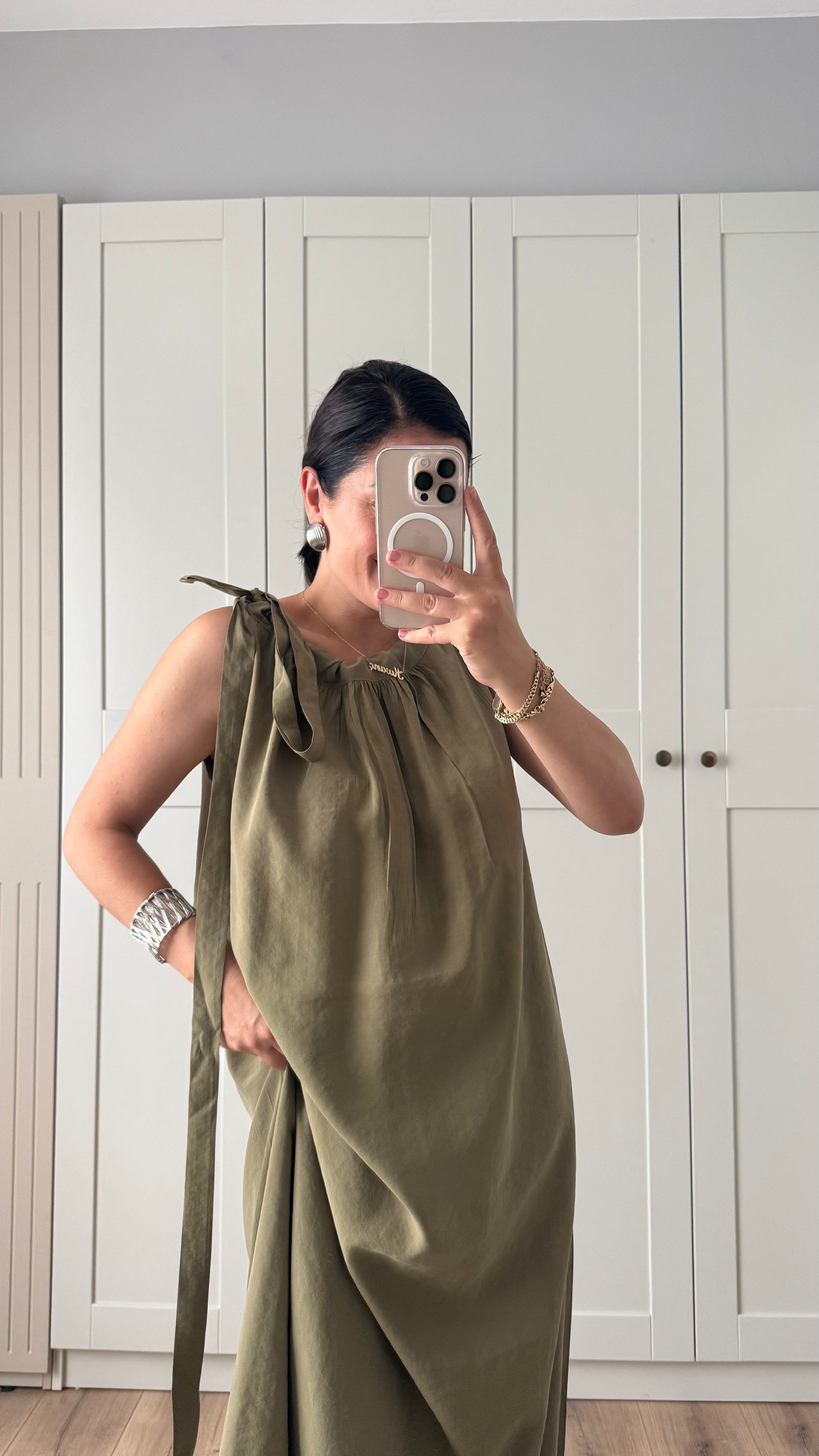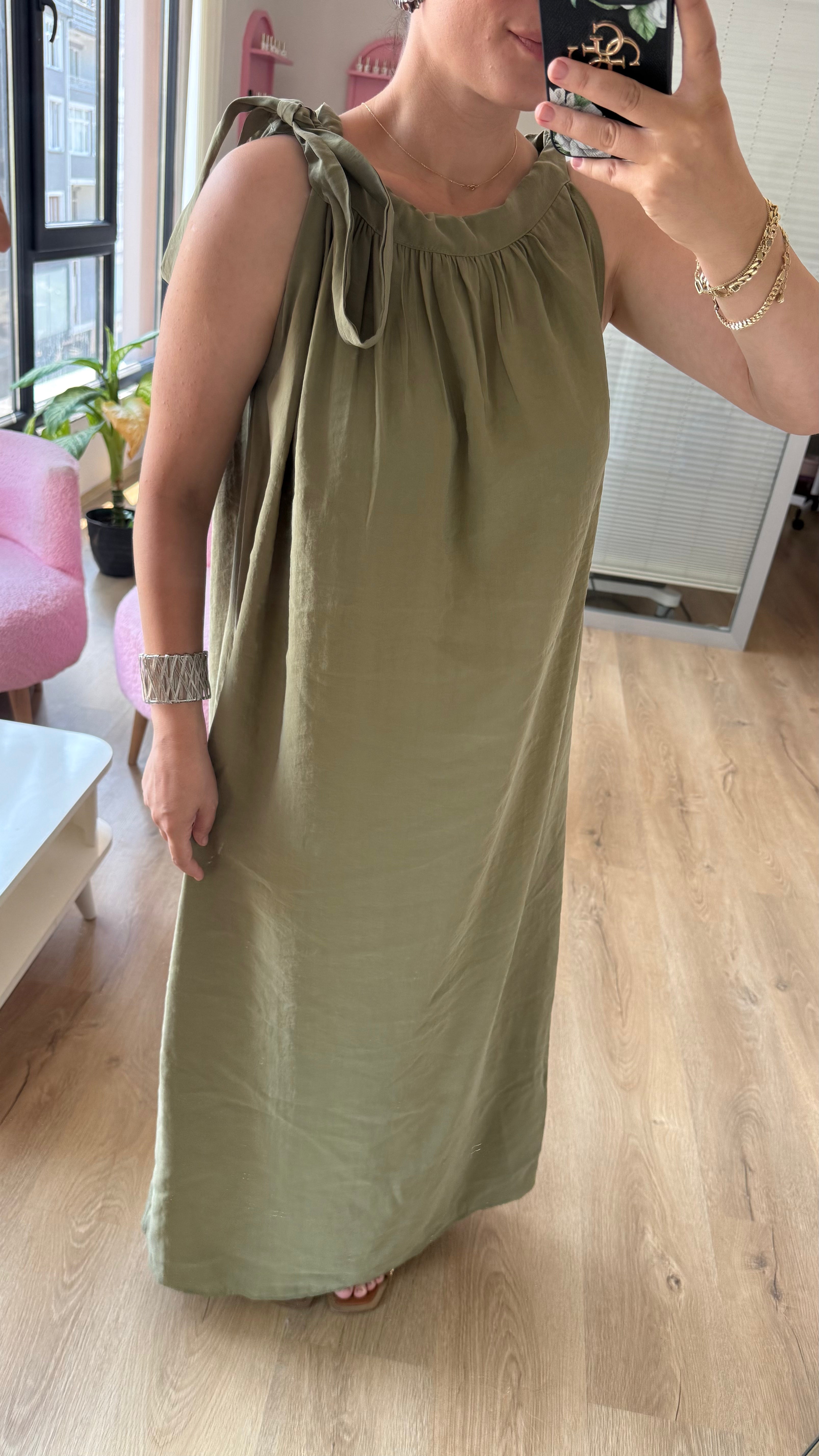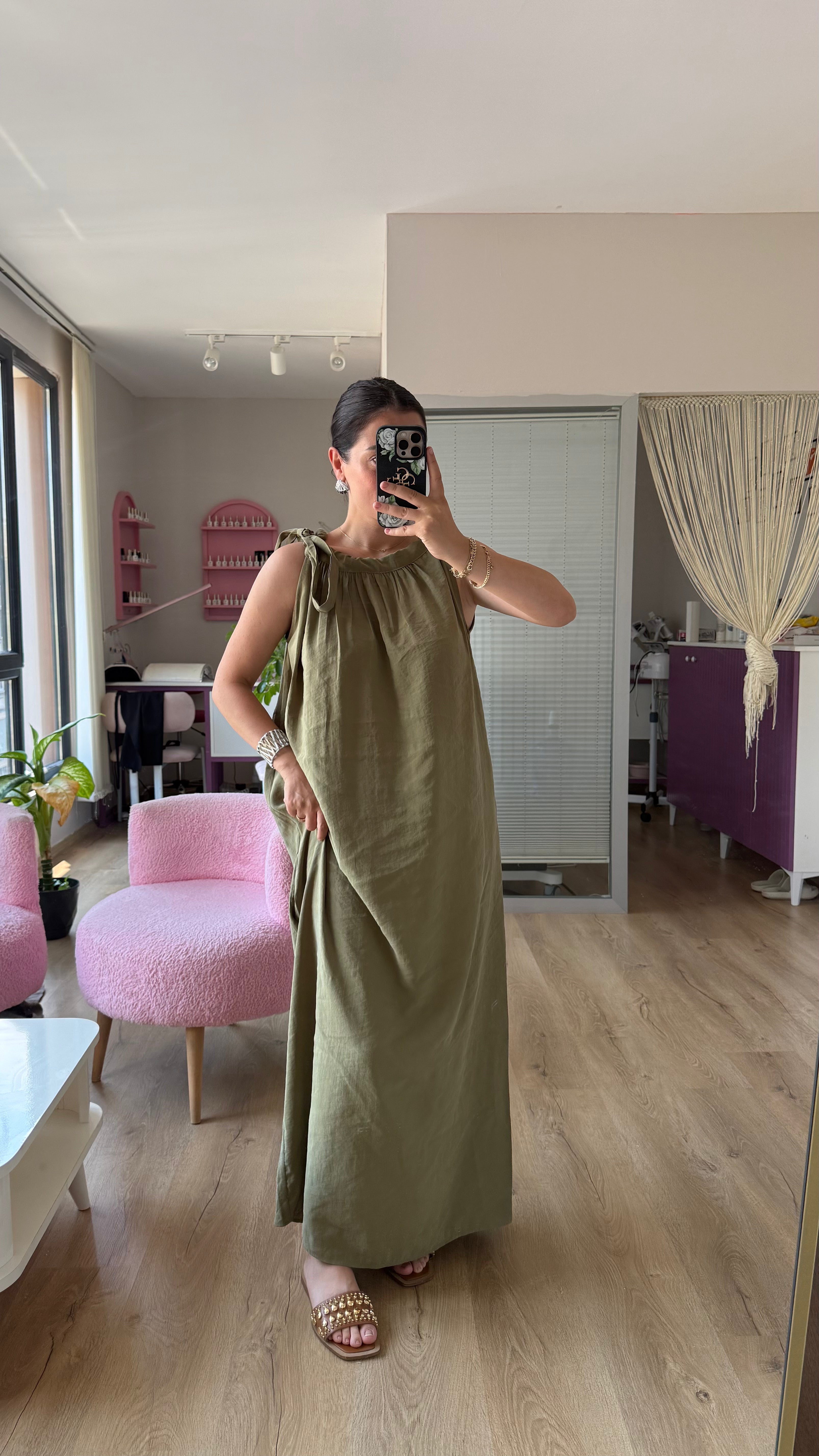 HAKİ RENK OMUZDAN BAĞLAMA DETAYLI ELBİSE