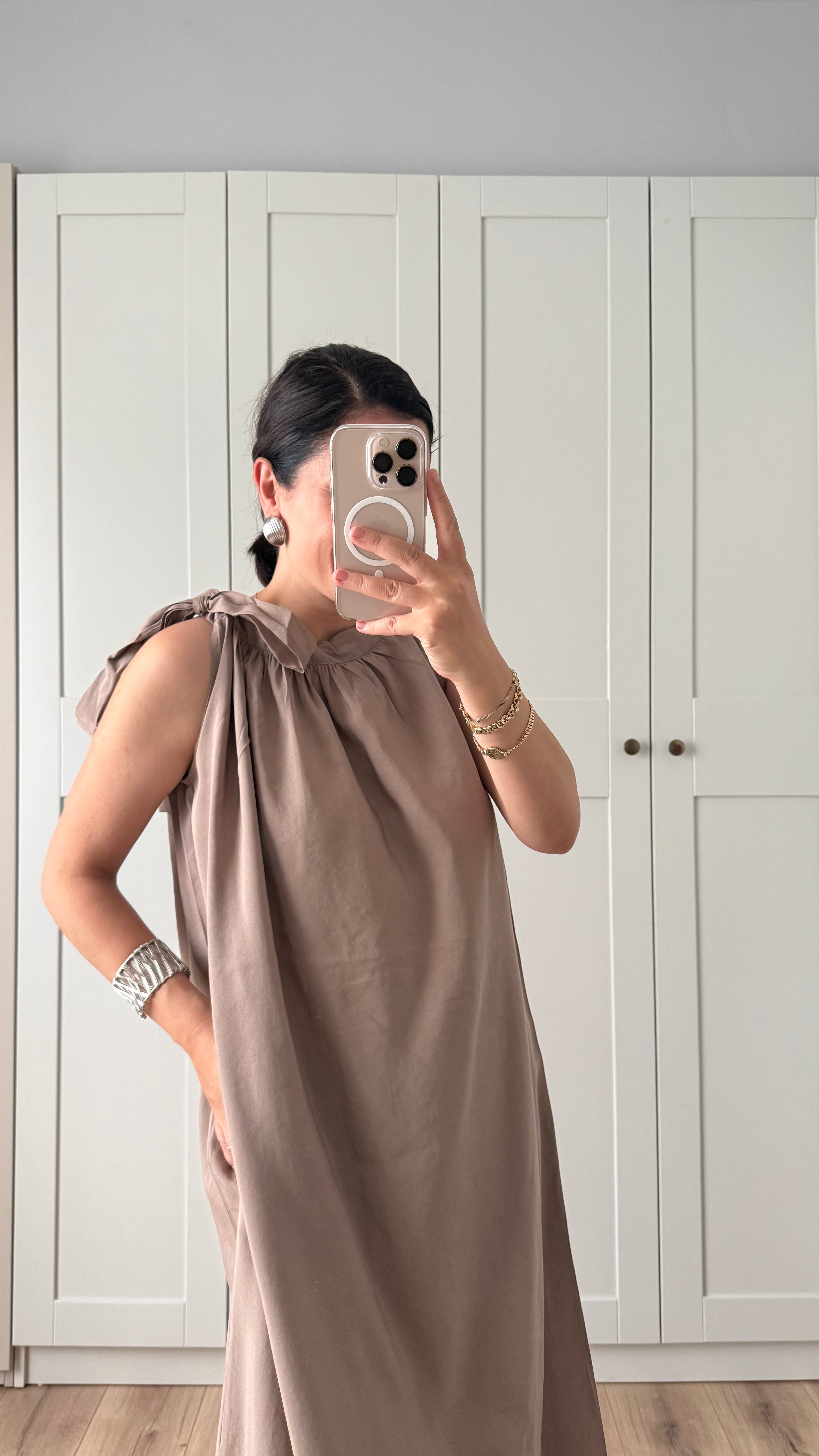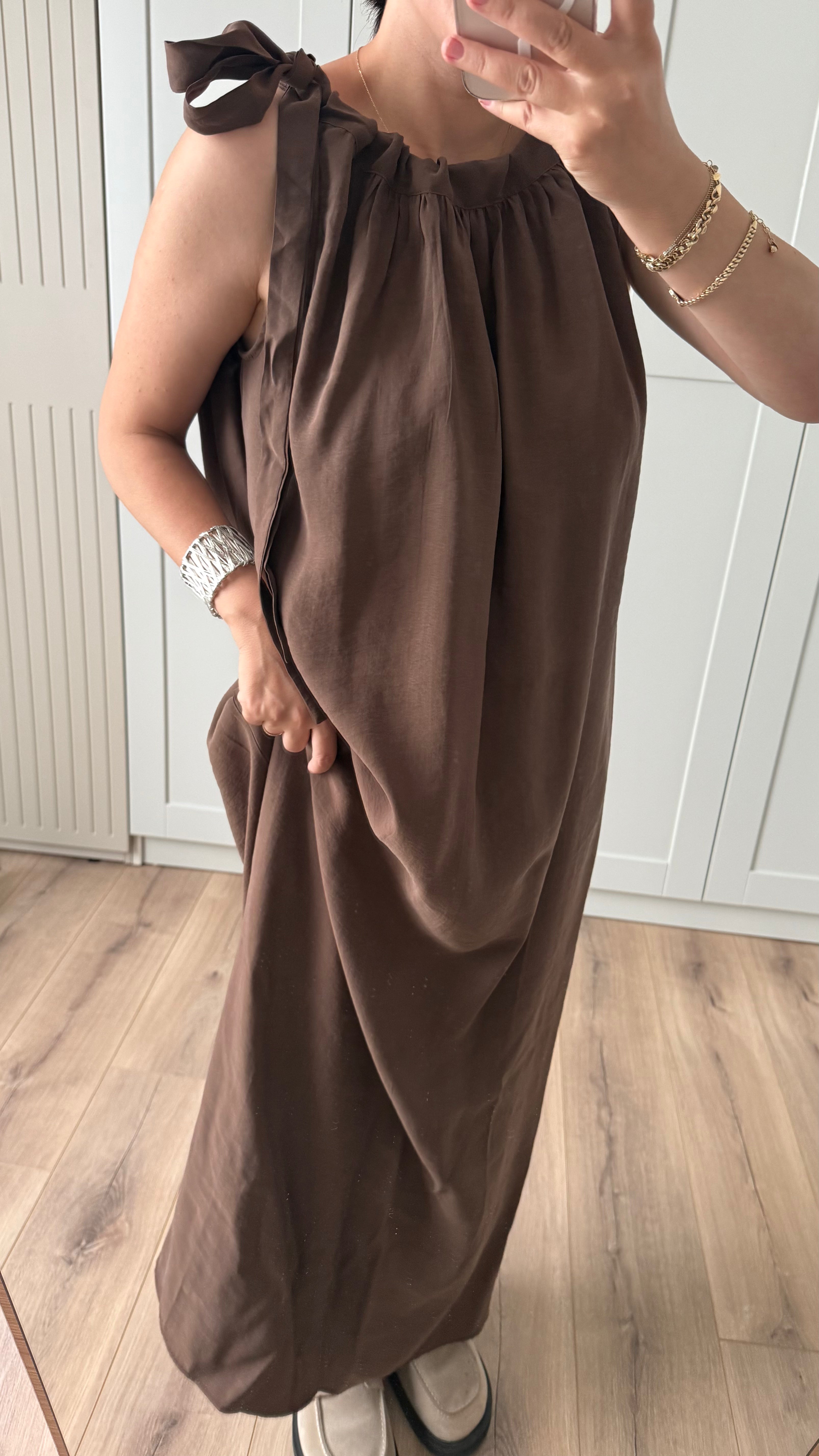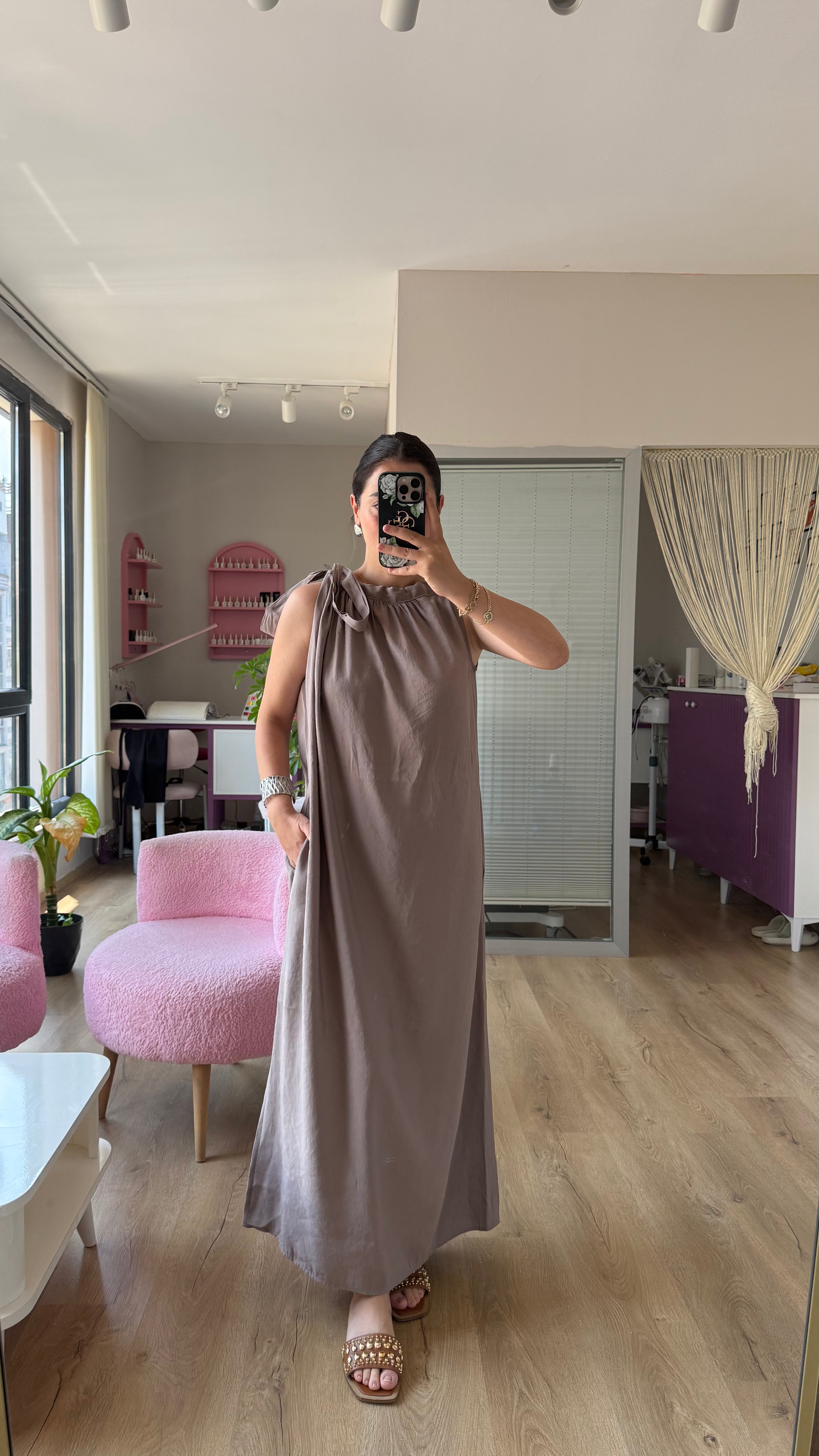 KAHVERENGİ OMUZDSAN BAĞLAMA ELBİSE