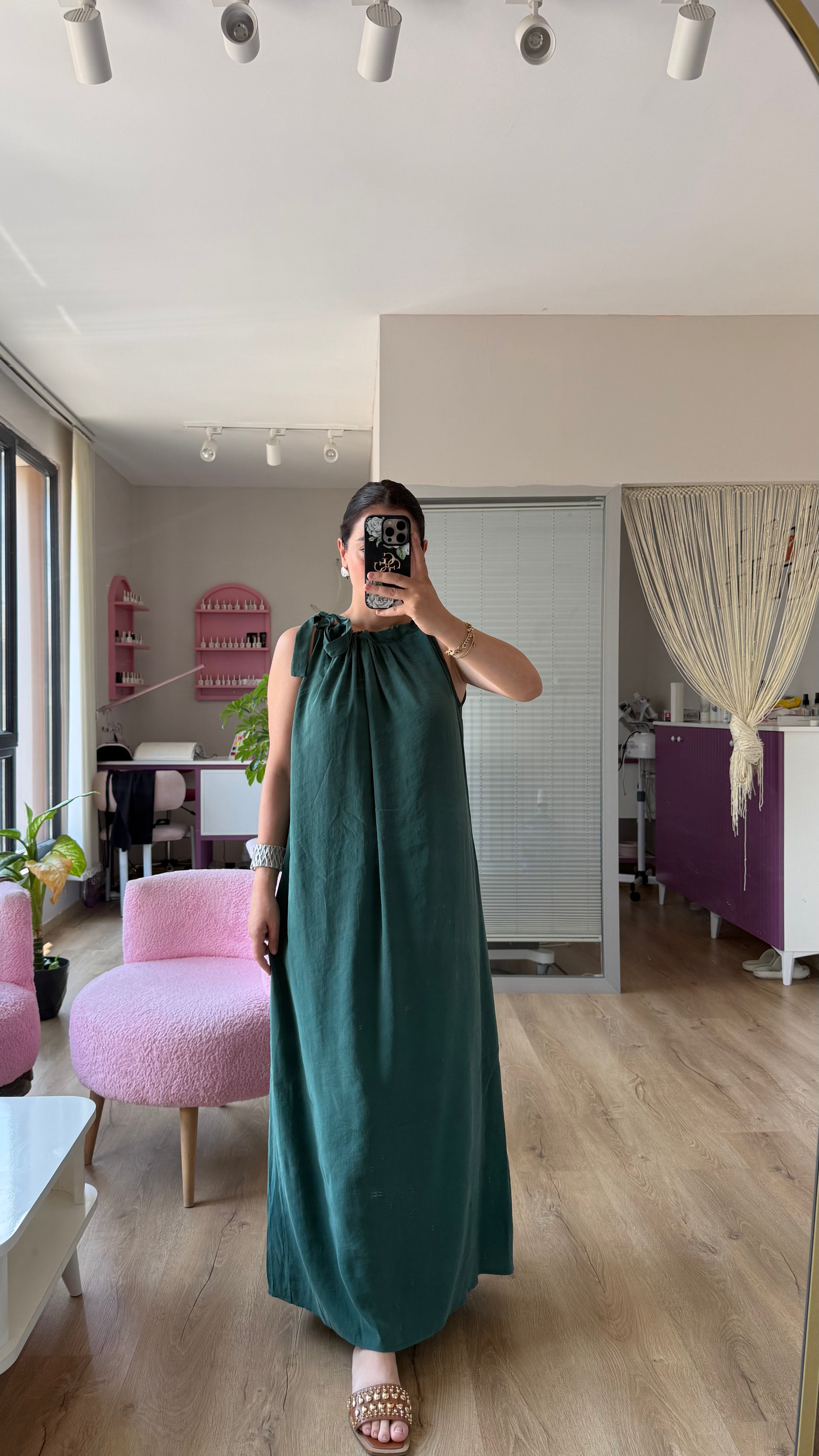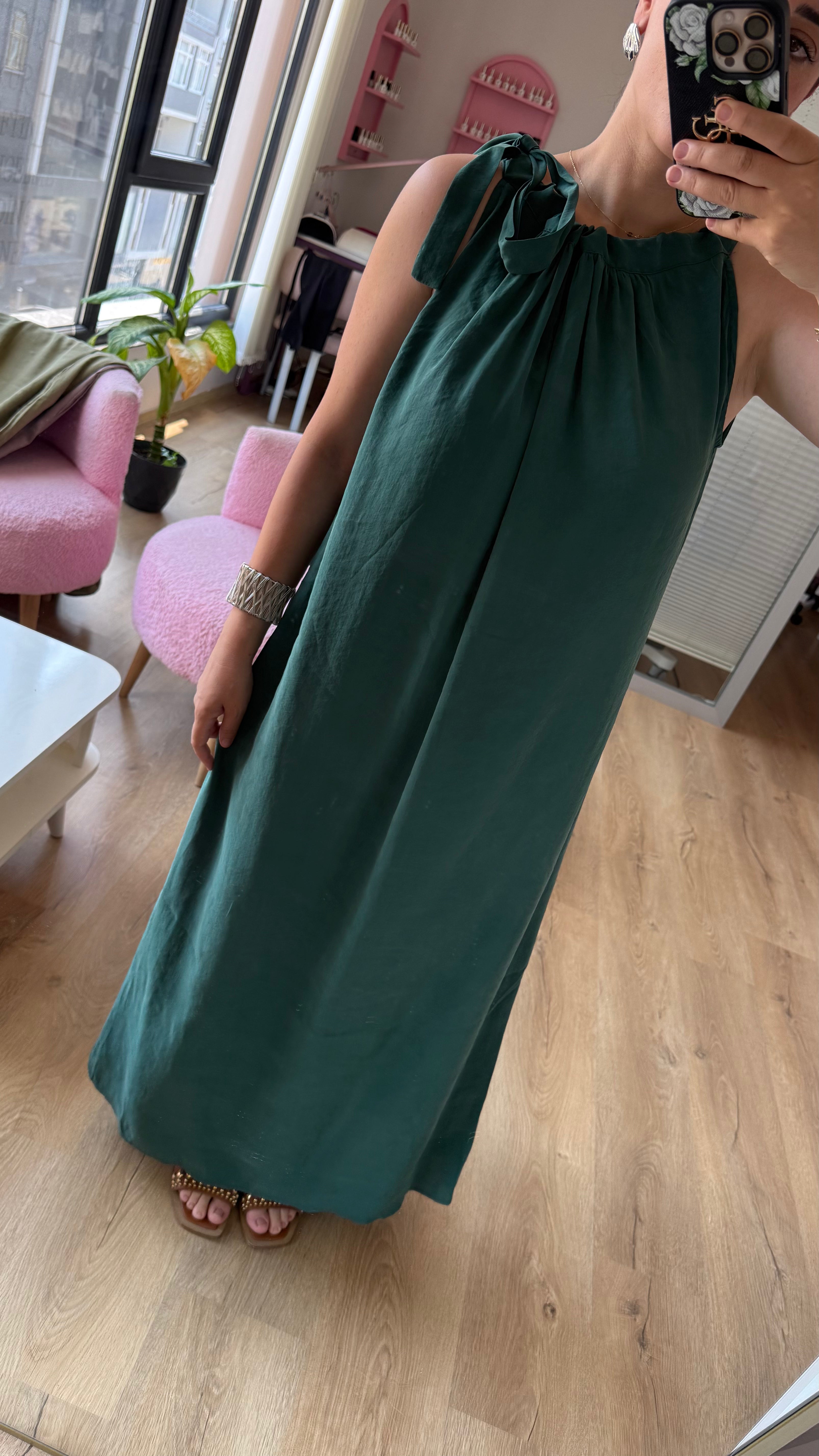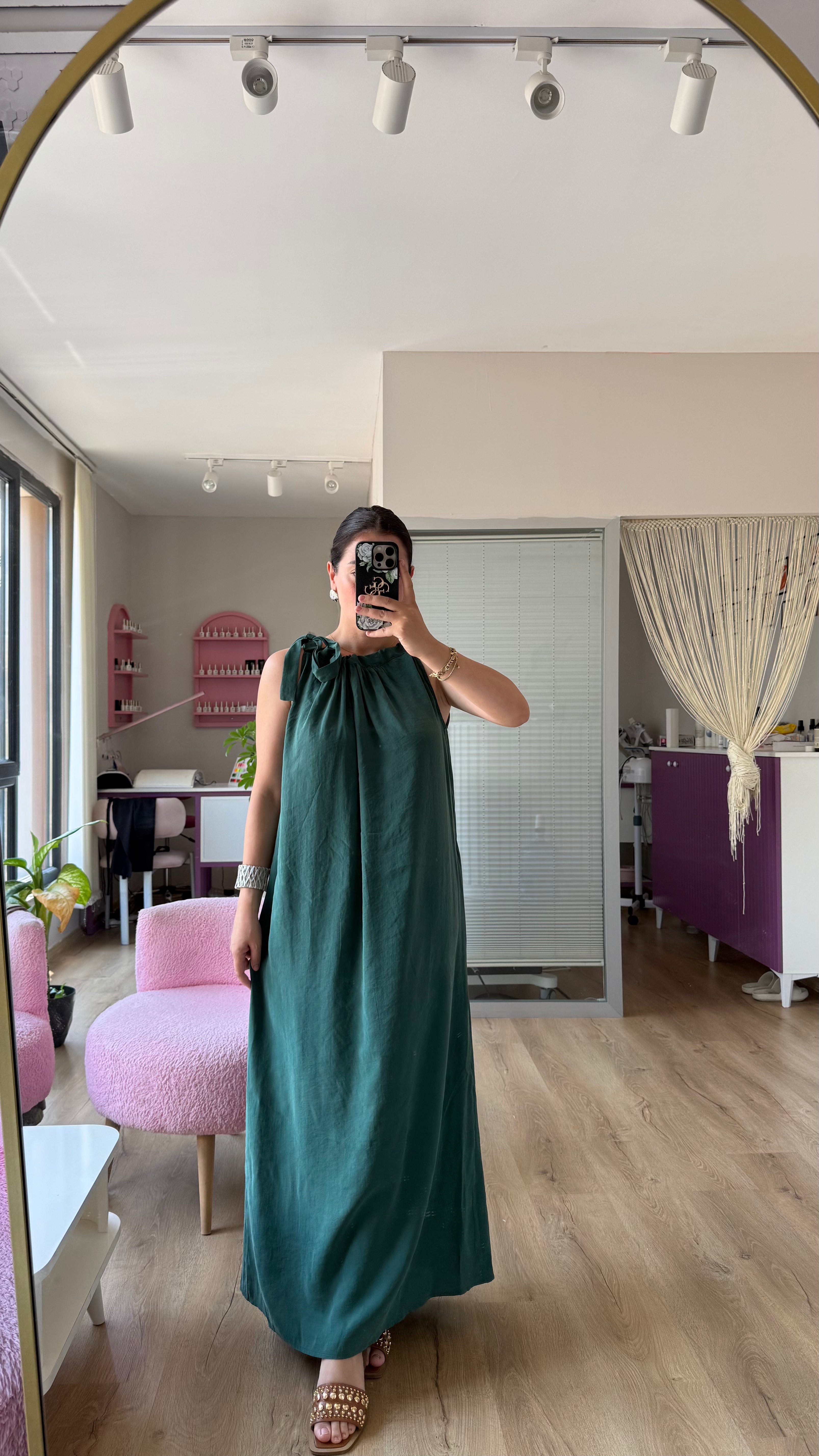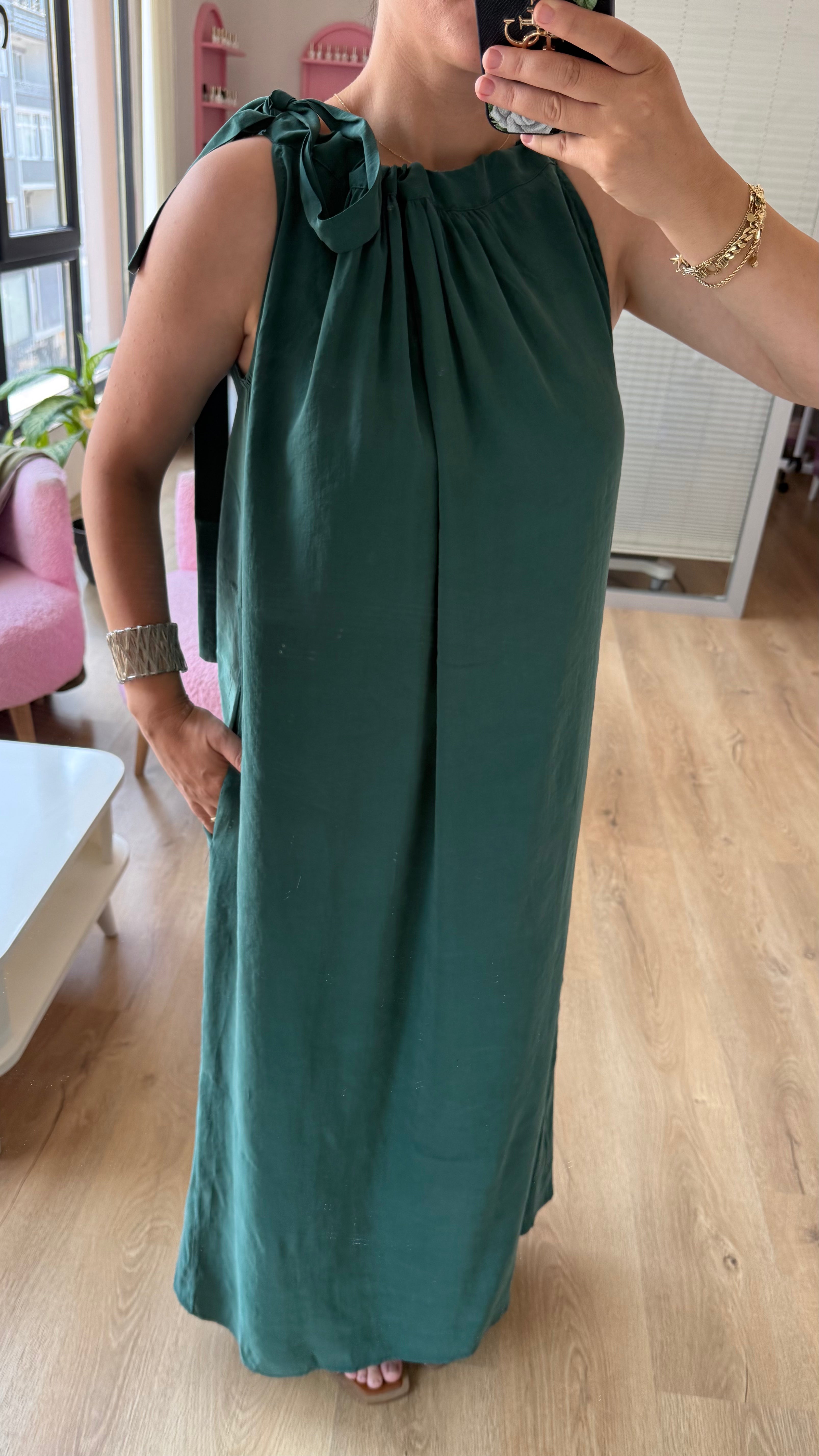 ZÜMRÜT YEŞİLİ OMUZDAN BAĞLAMA DETAYLI ELBİSE