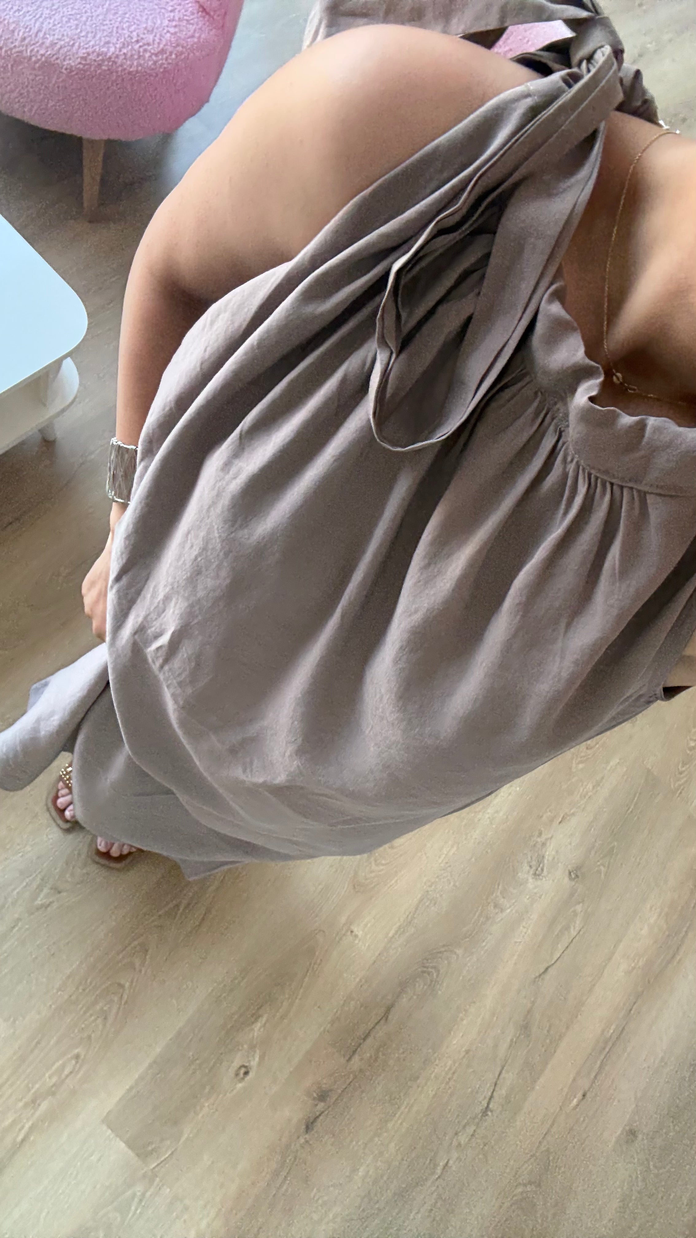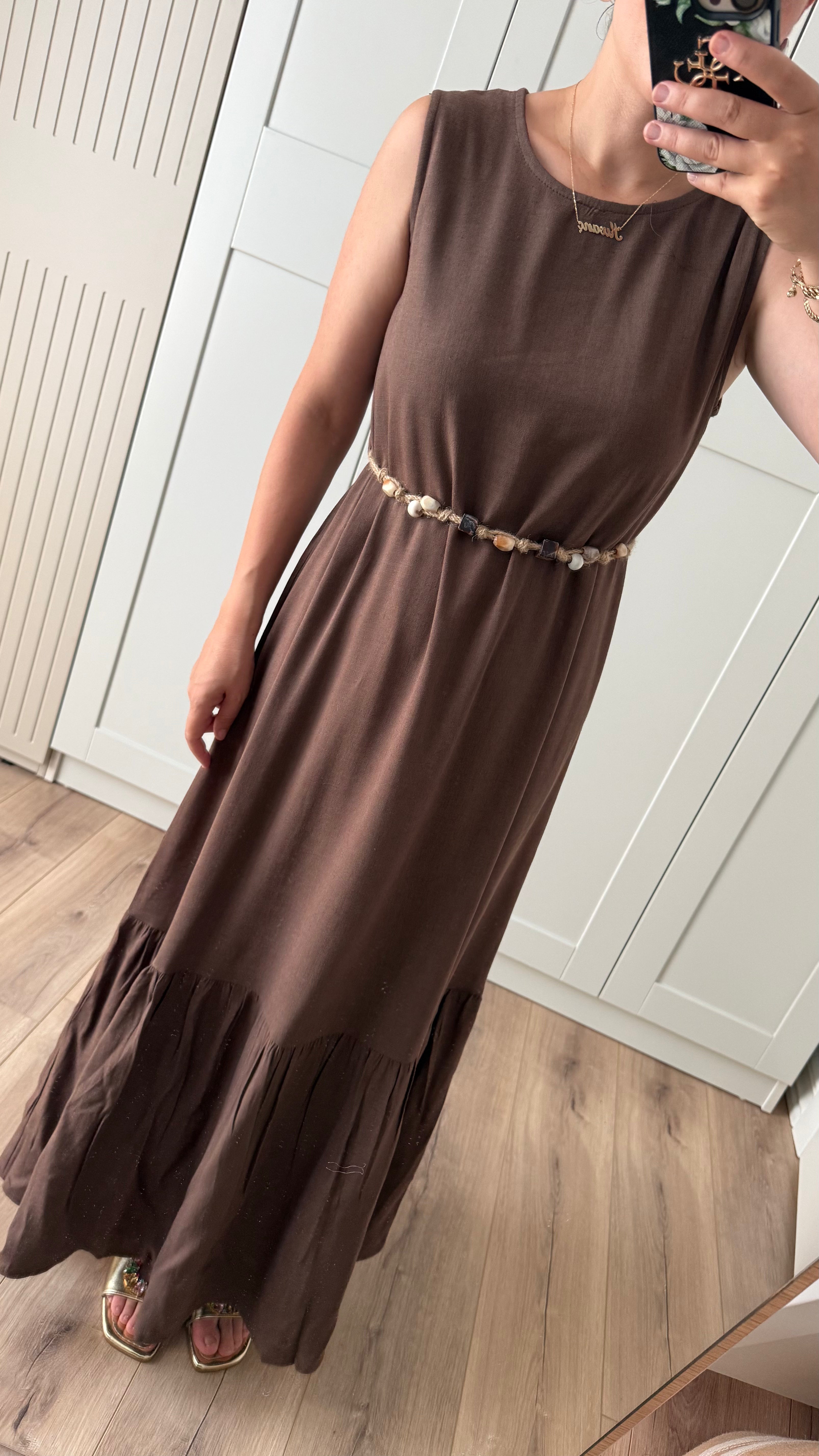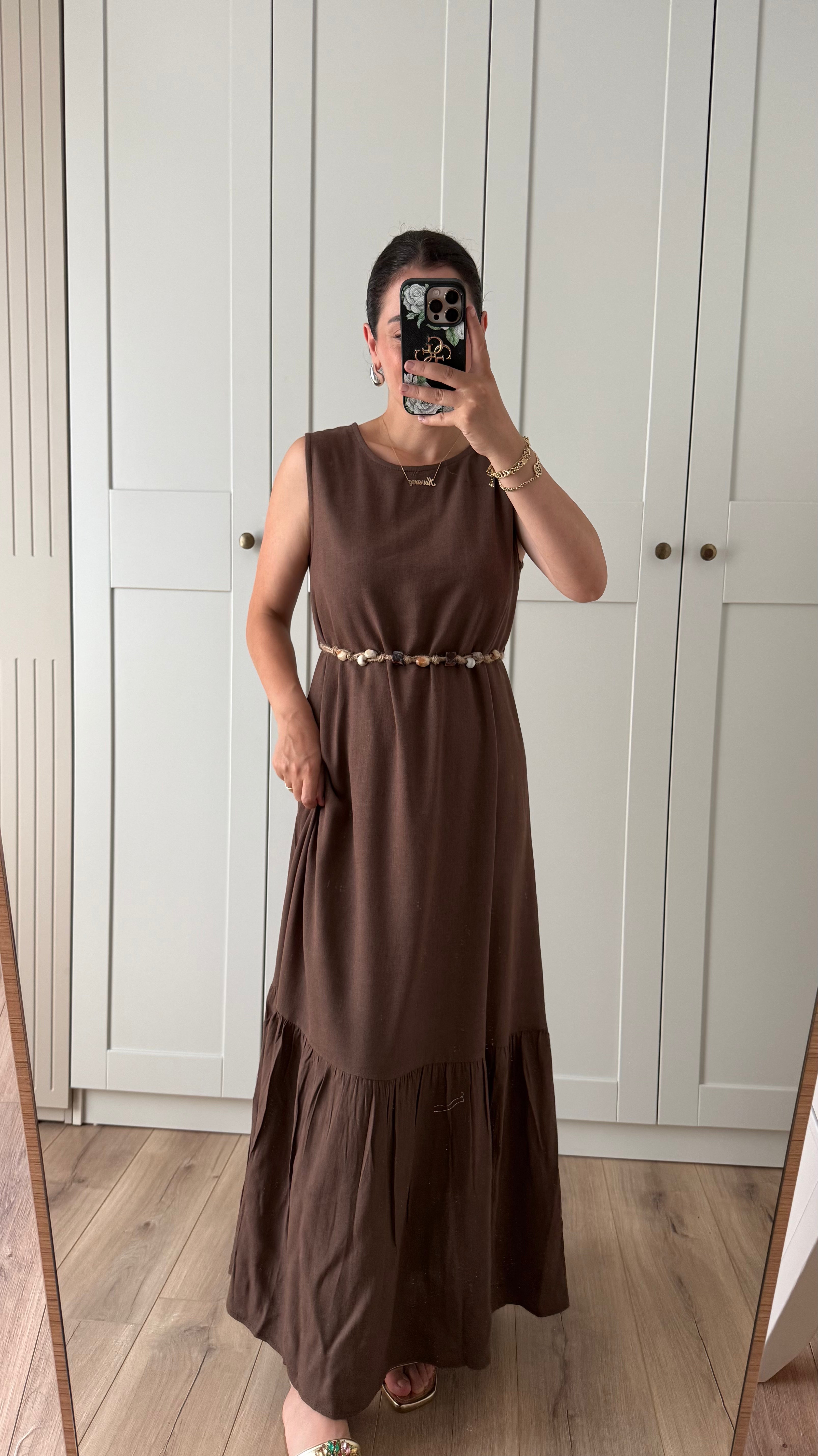 BONCUK KEMERLİ KETEN MAXİ ELBİSE-KAHVERENGİ