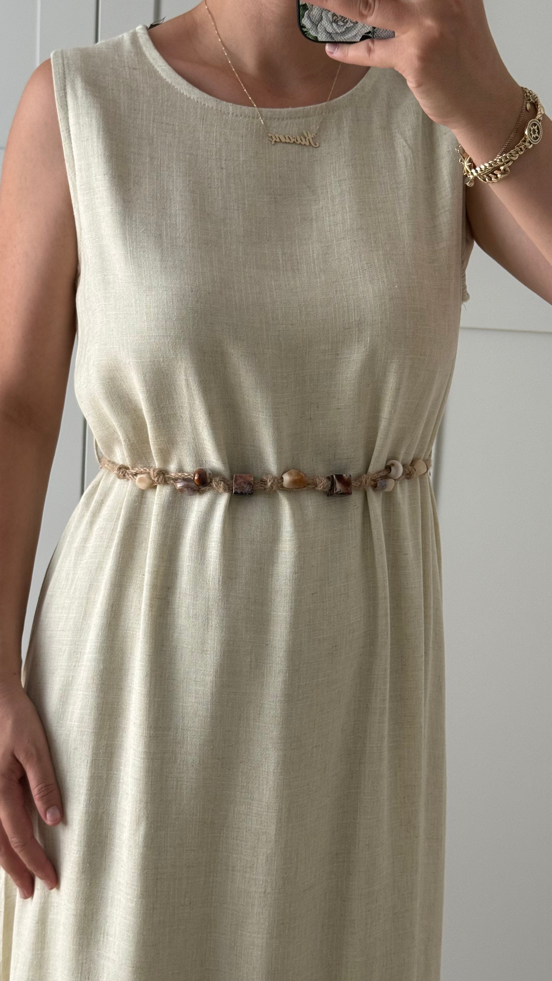 BONCUK KEMERLİ KETEN MAXİ ELBİSE-AÇIK SARI