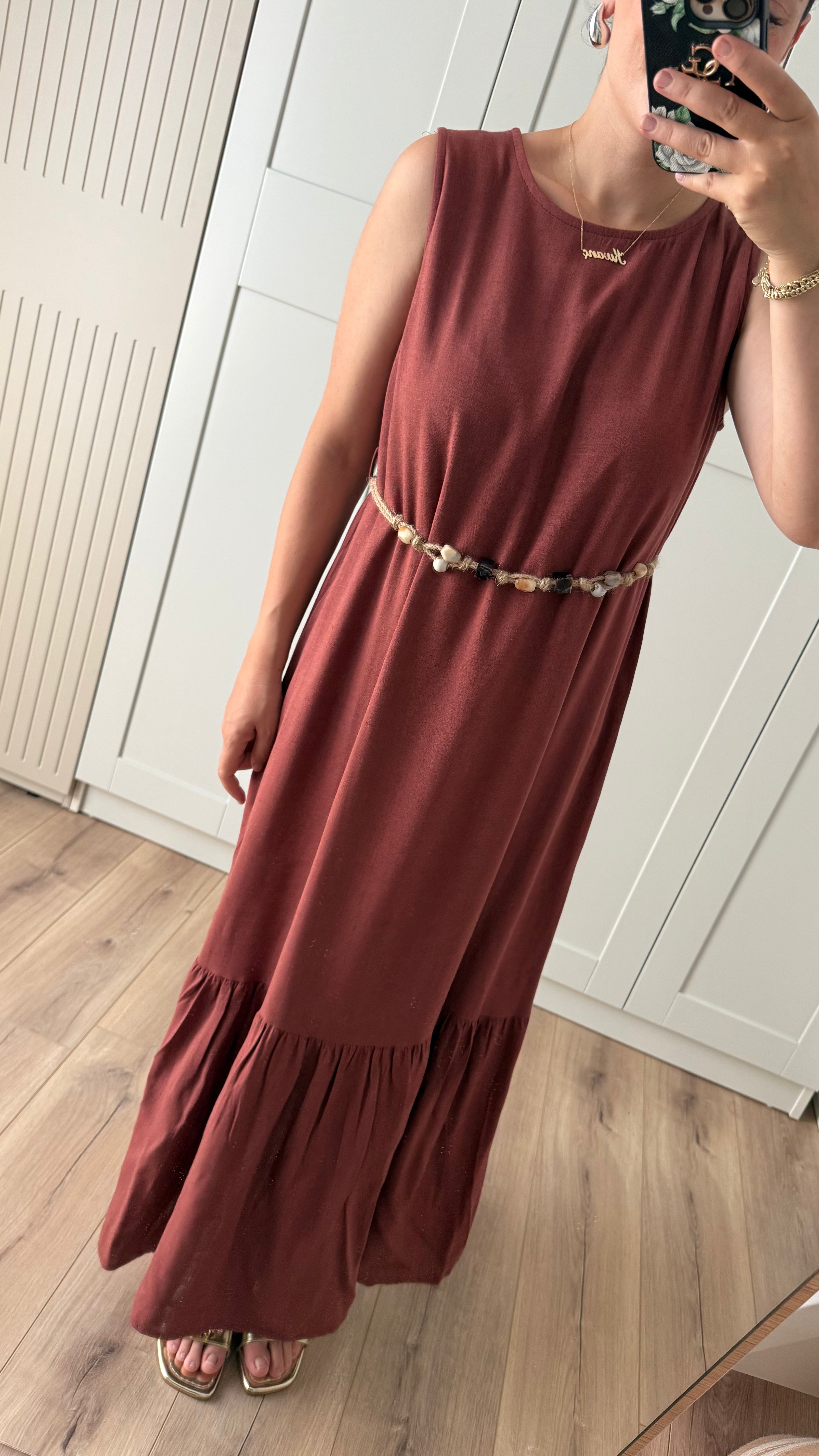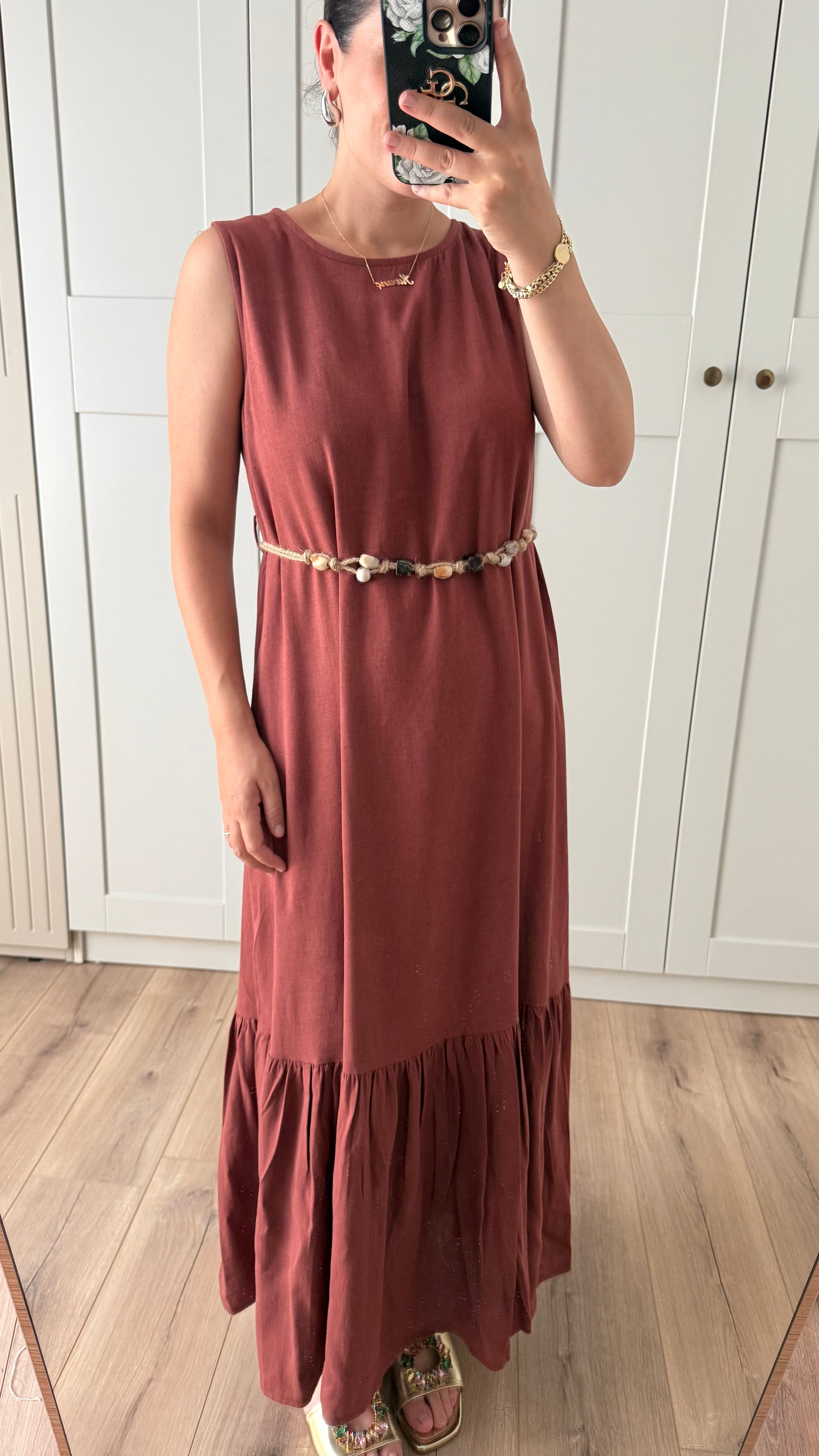 BONCUK KEMERLİ KETEN MAXİ ELBİSE-TARÇIN RENK