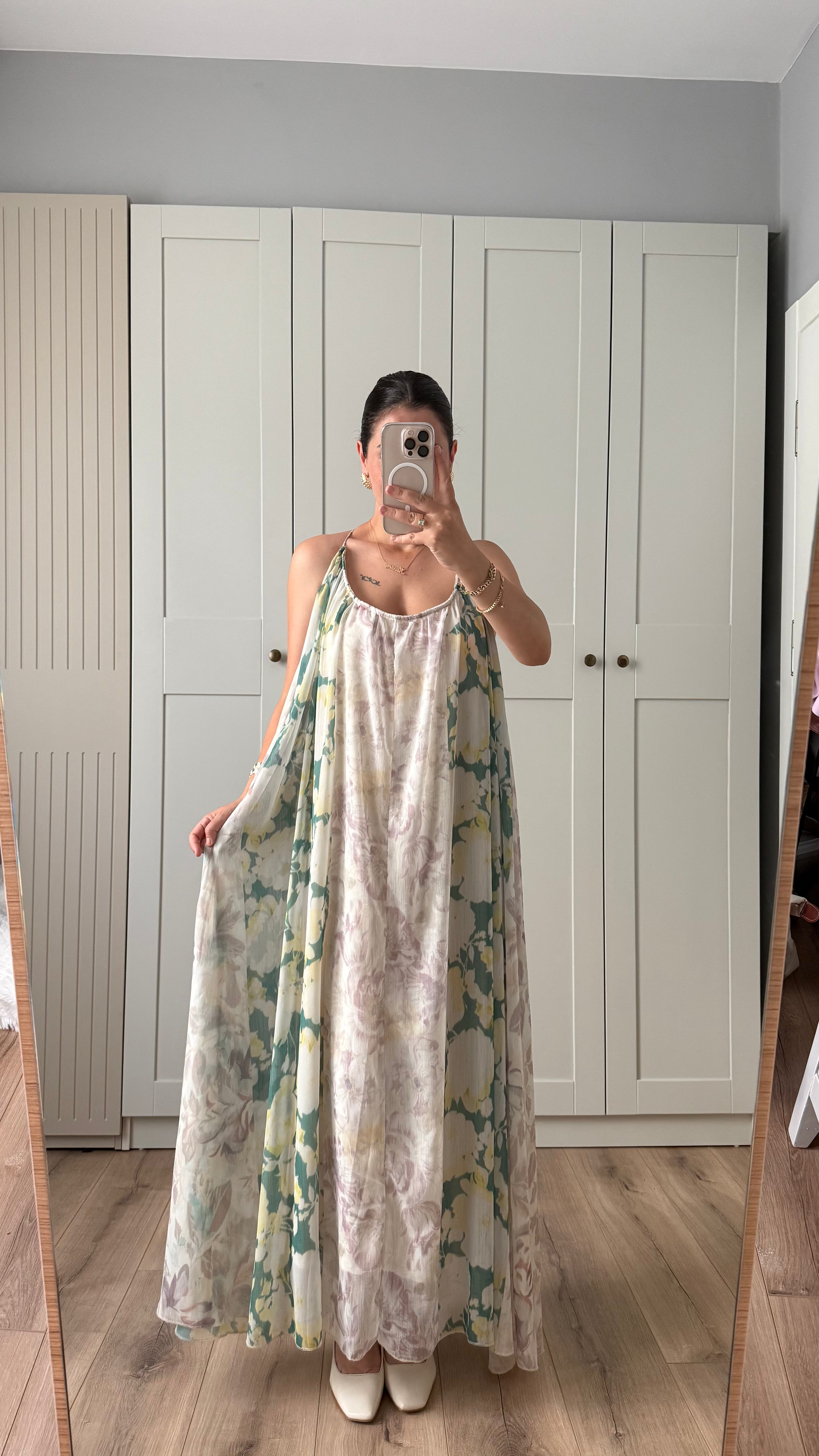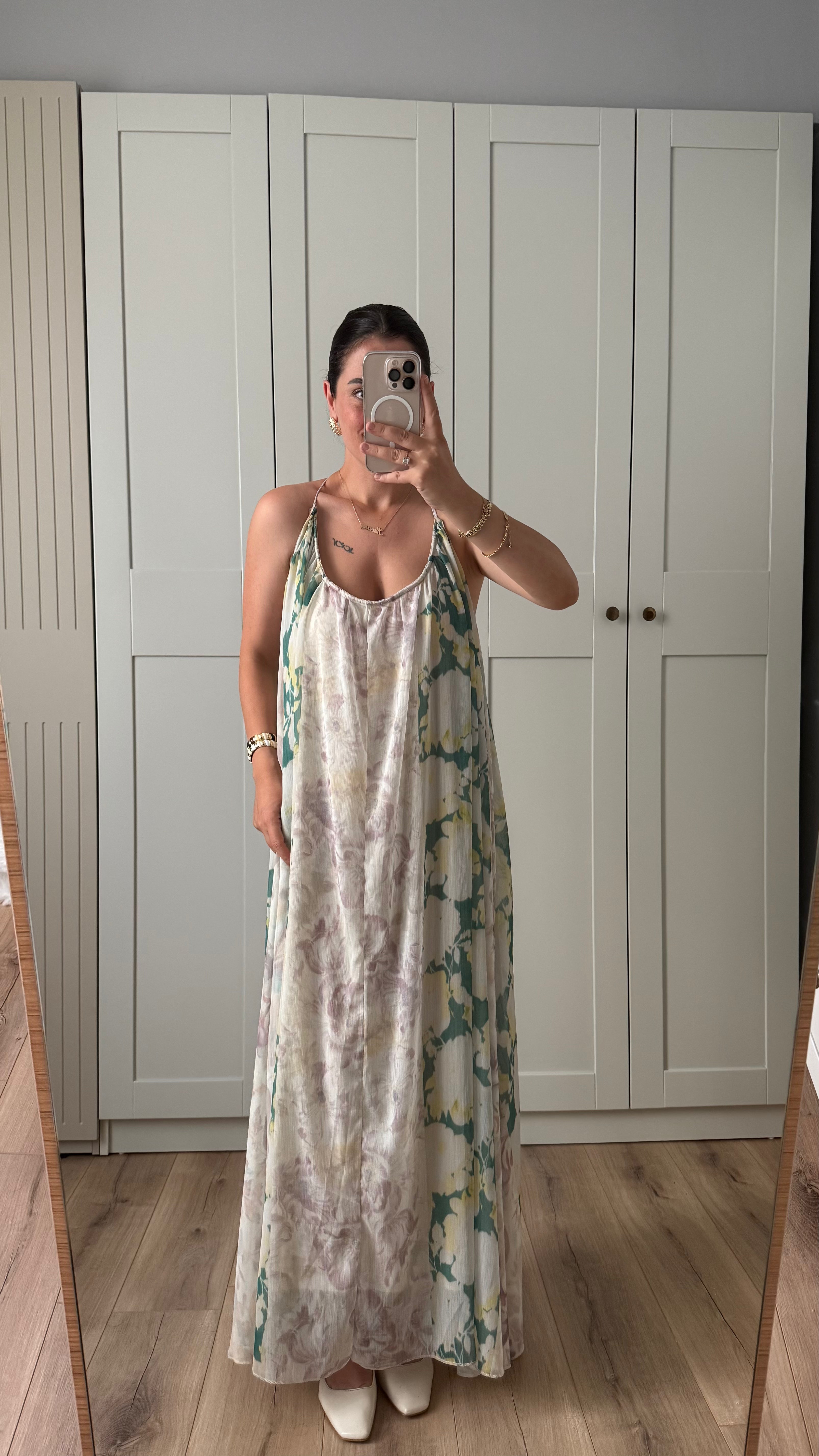 ASKILI YEŞİL ÇİÇEK DESENLİÖŞİFON ELBİSE