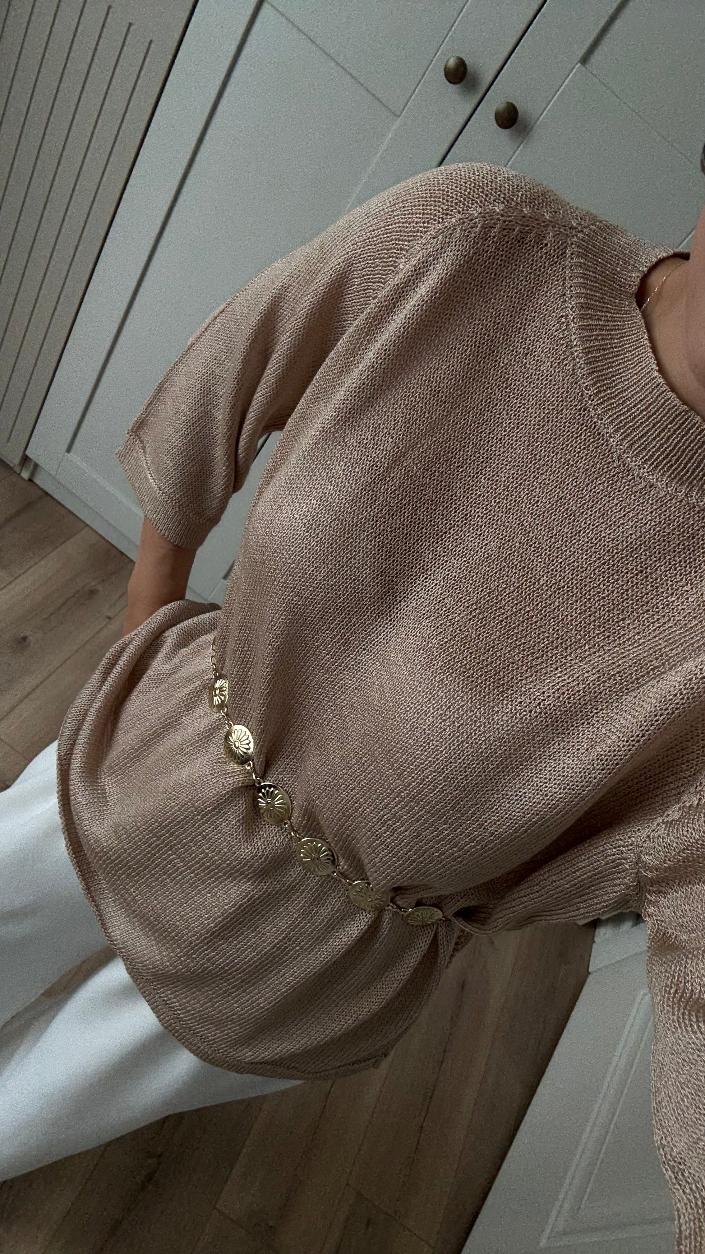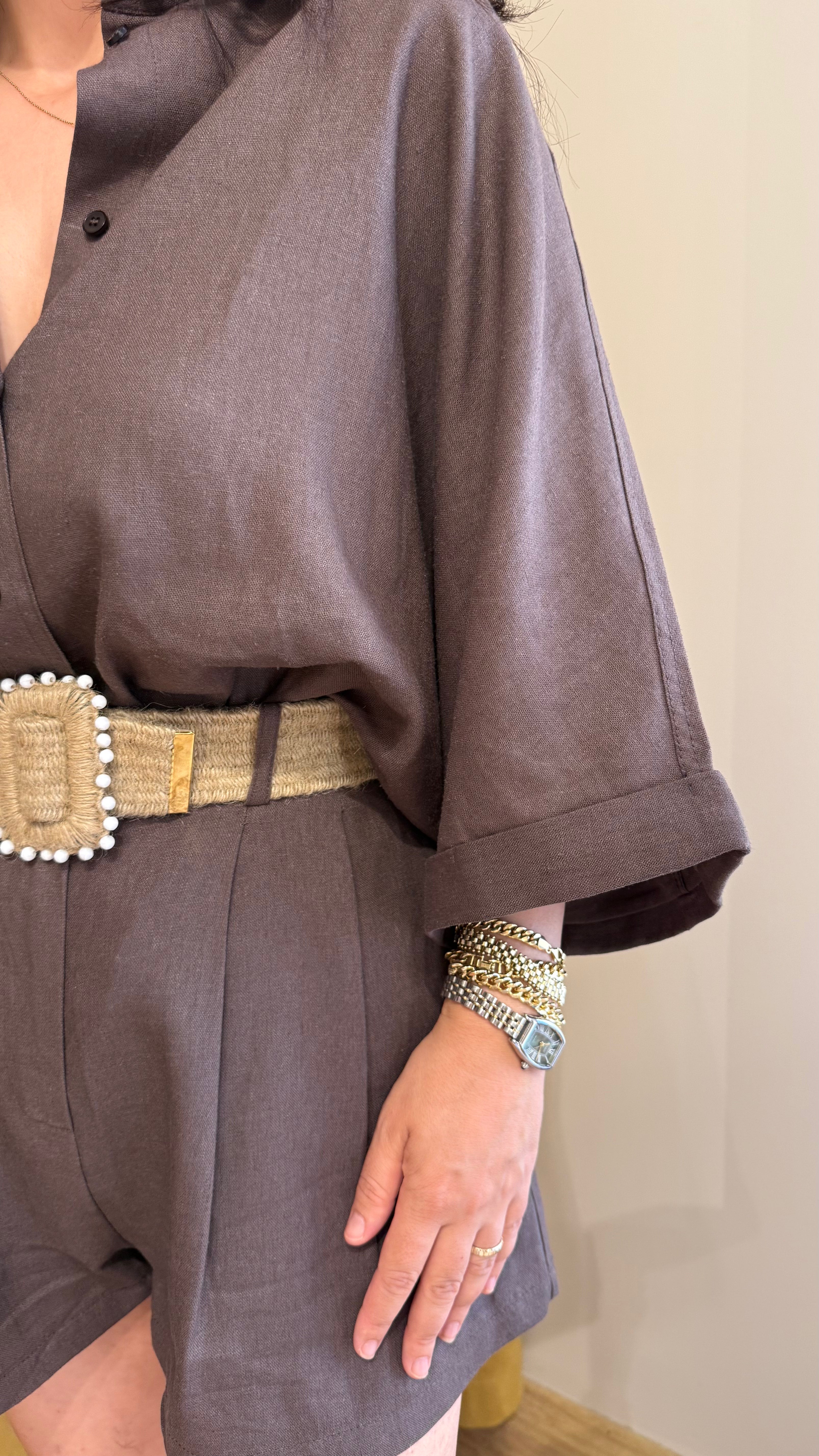 KAHVERENGİ HASIR KEMERLİ GÖMLEK ŞORT TAKIM