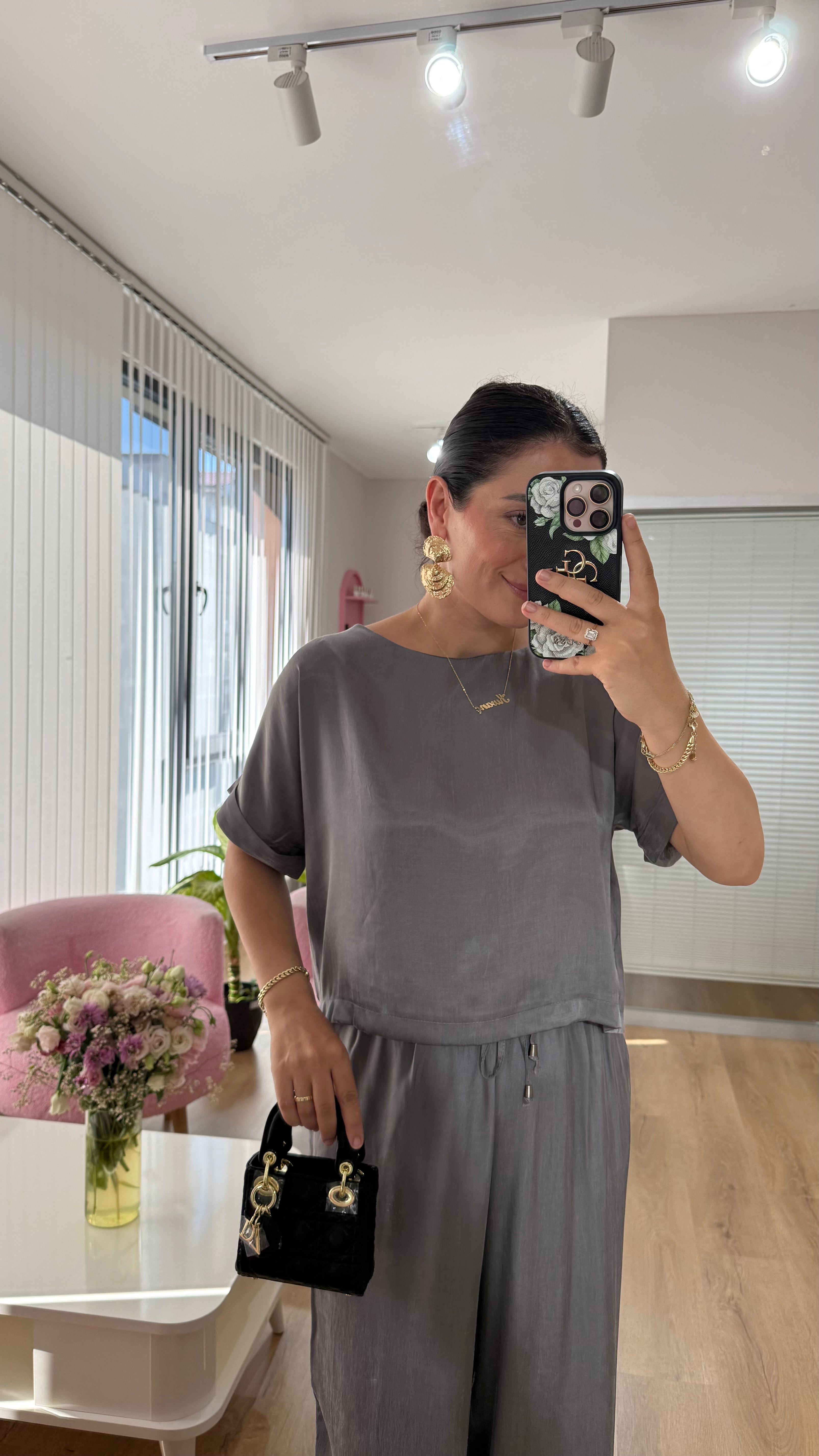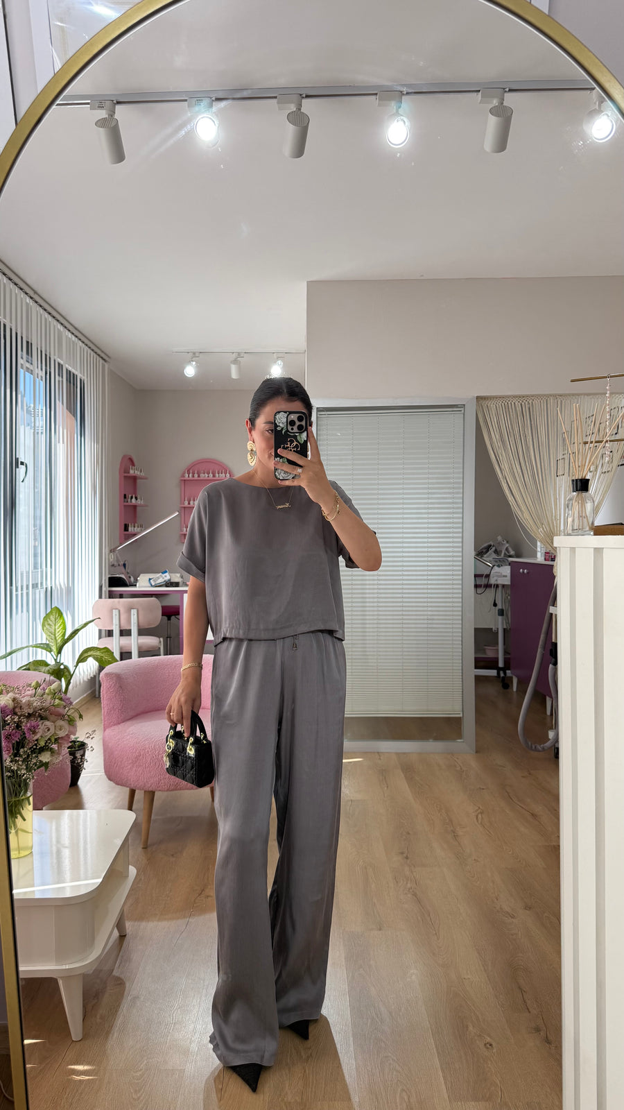 GRİ BLUZ PANTOLON DOKULU TAKIM