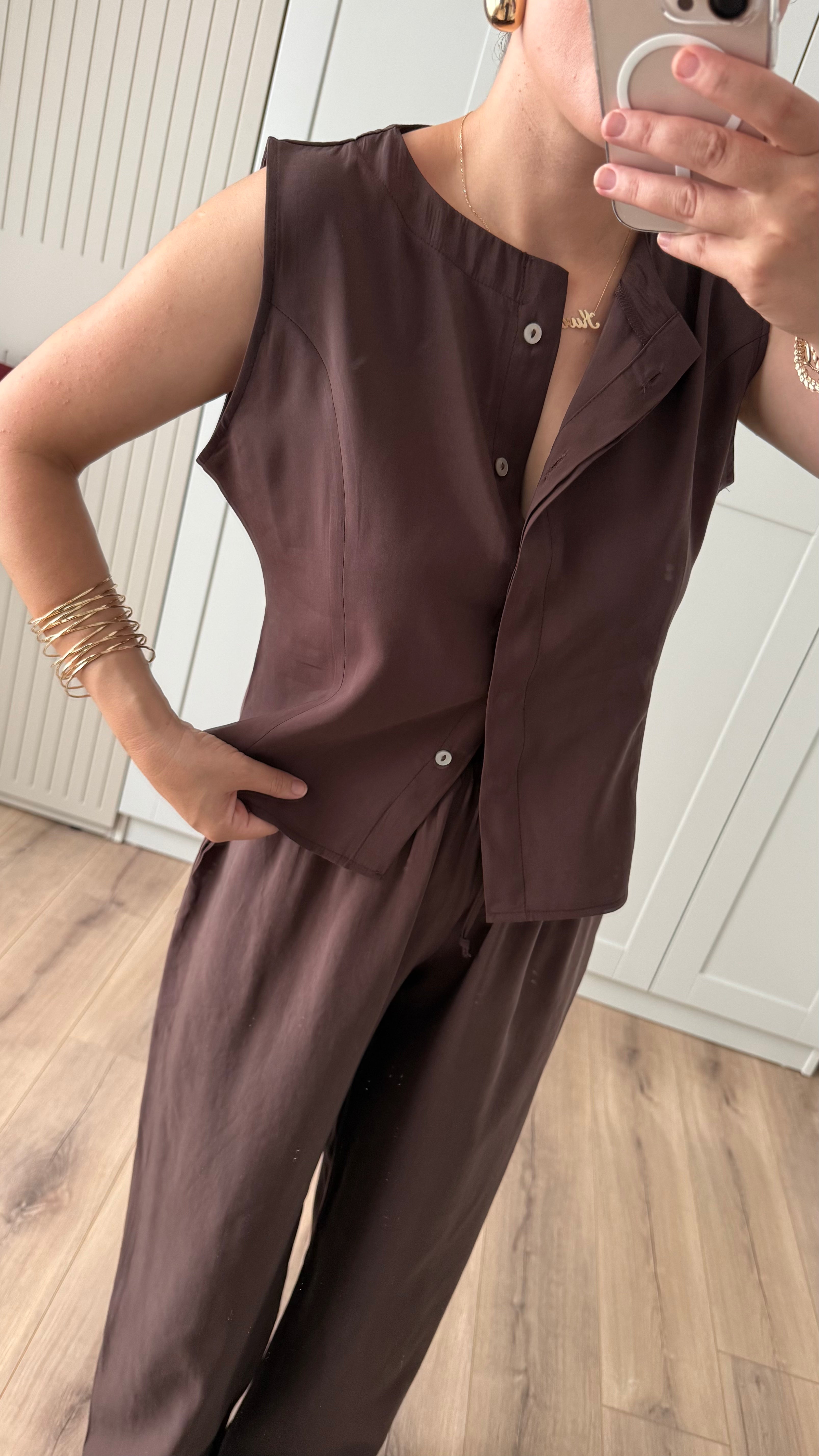 TENSEL KUMAŞ YELEKLİ TAKIM-KAHVE