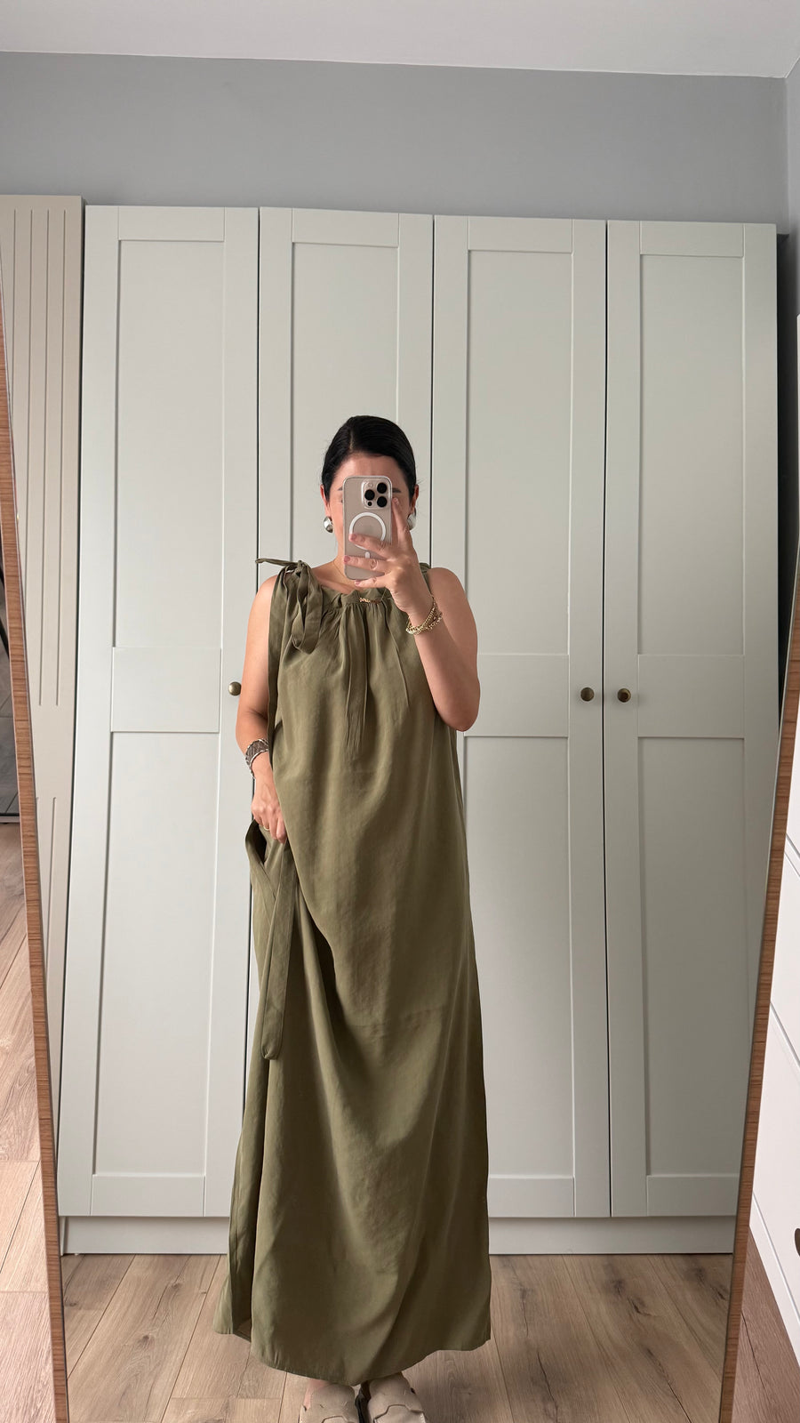 HAKİ RENK OMUZDAN BAĞLAMA DETAYLI ELBİSE