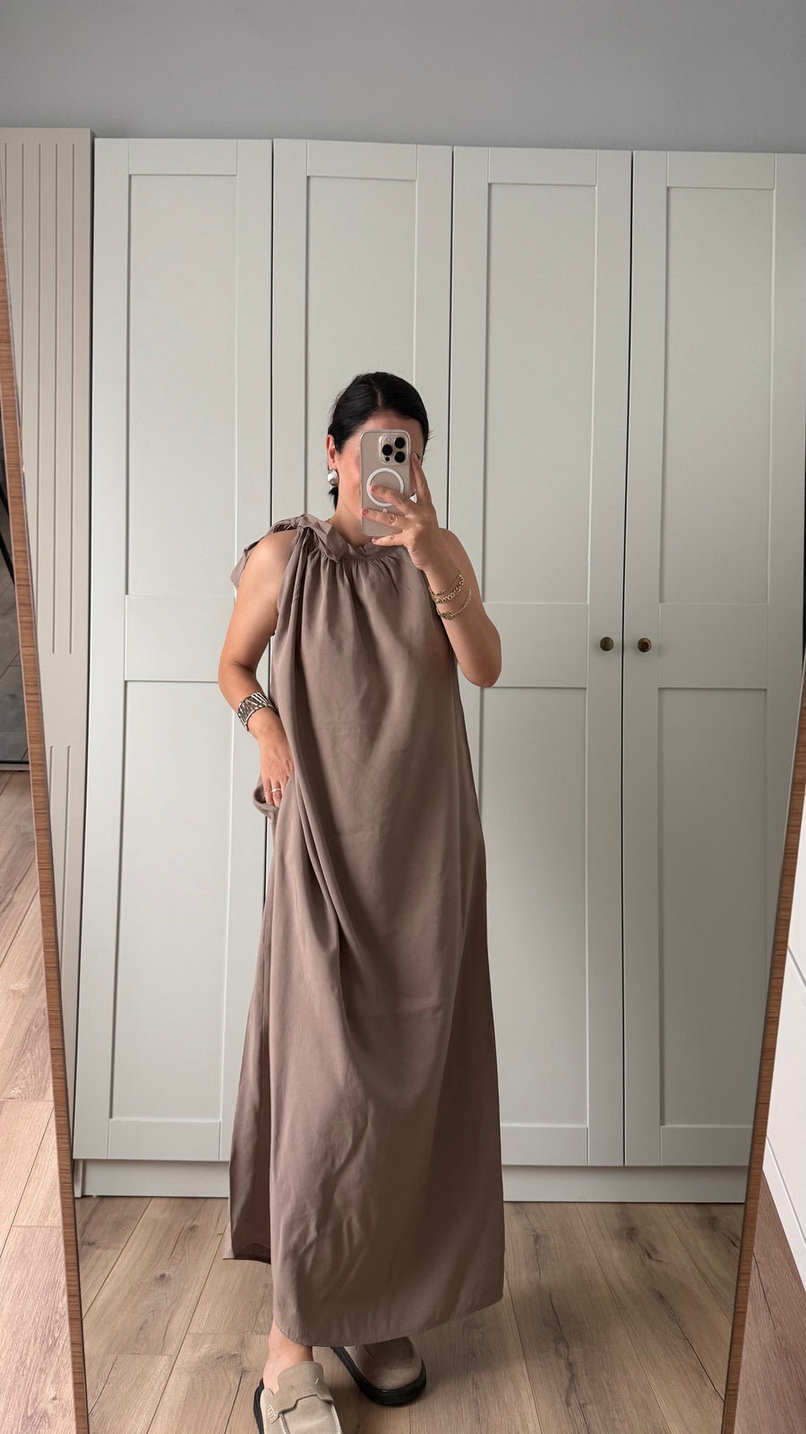 BONCUK KEMERLİ KETEN MAXİ ELBİSE-KAHVERENGİ