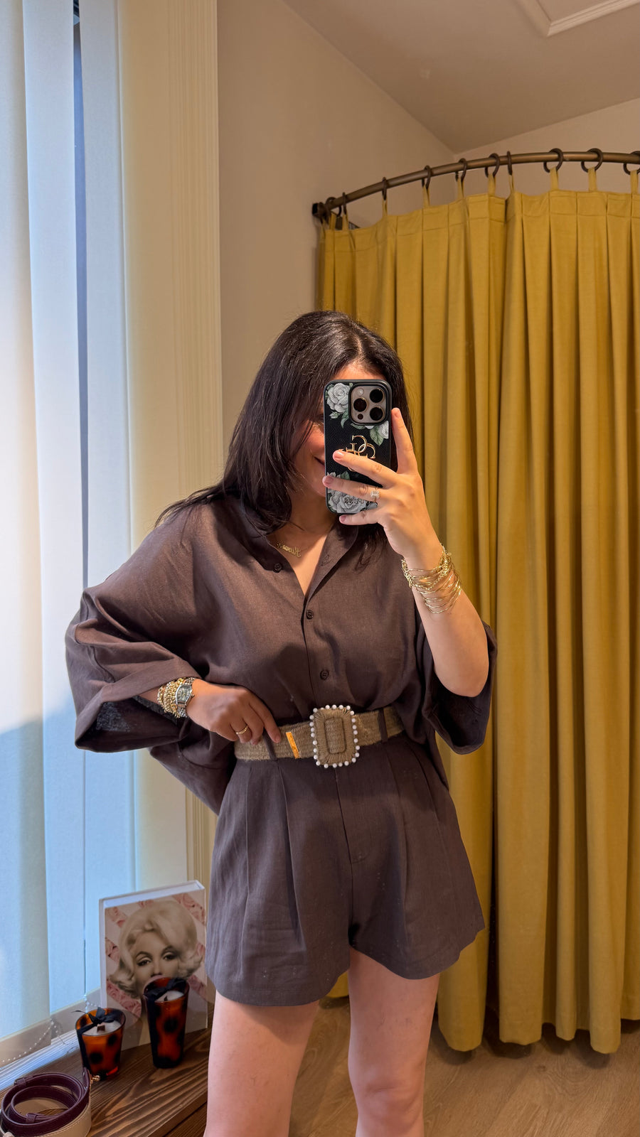 KAHVE KETEN KEMERLİ GÖMLEK ŞORT TAKIM