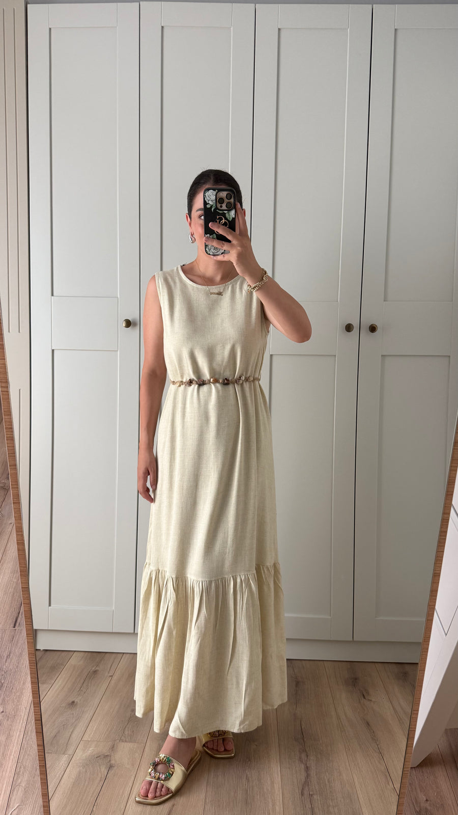 BONCUK KEMERLİ KETEN MAXİ ELBİSE-AÇIK SARI