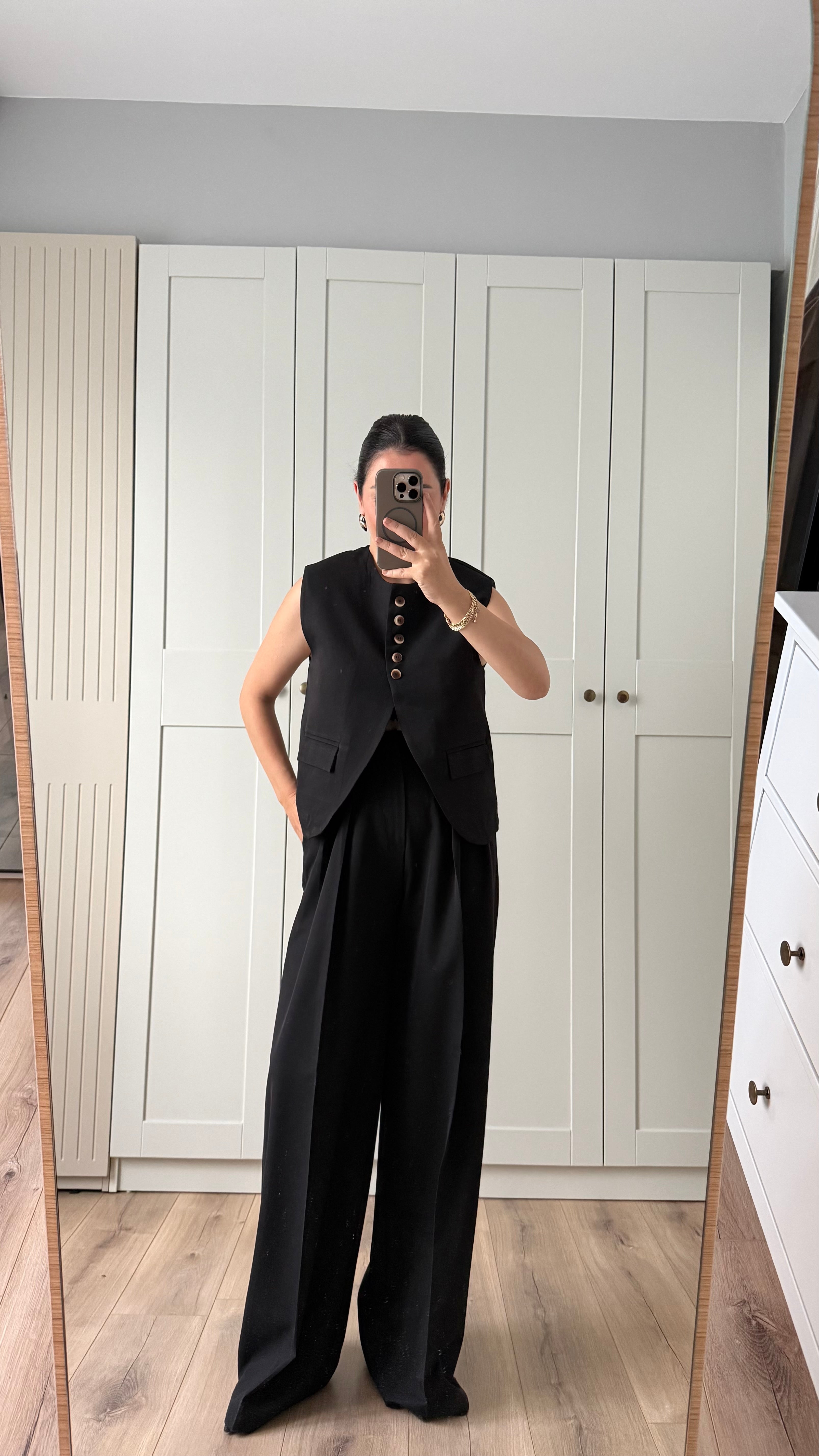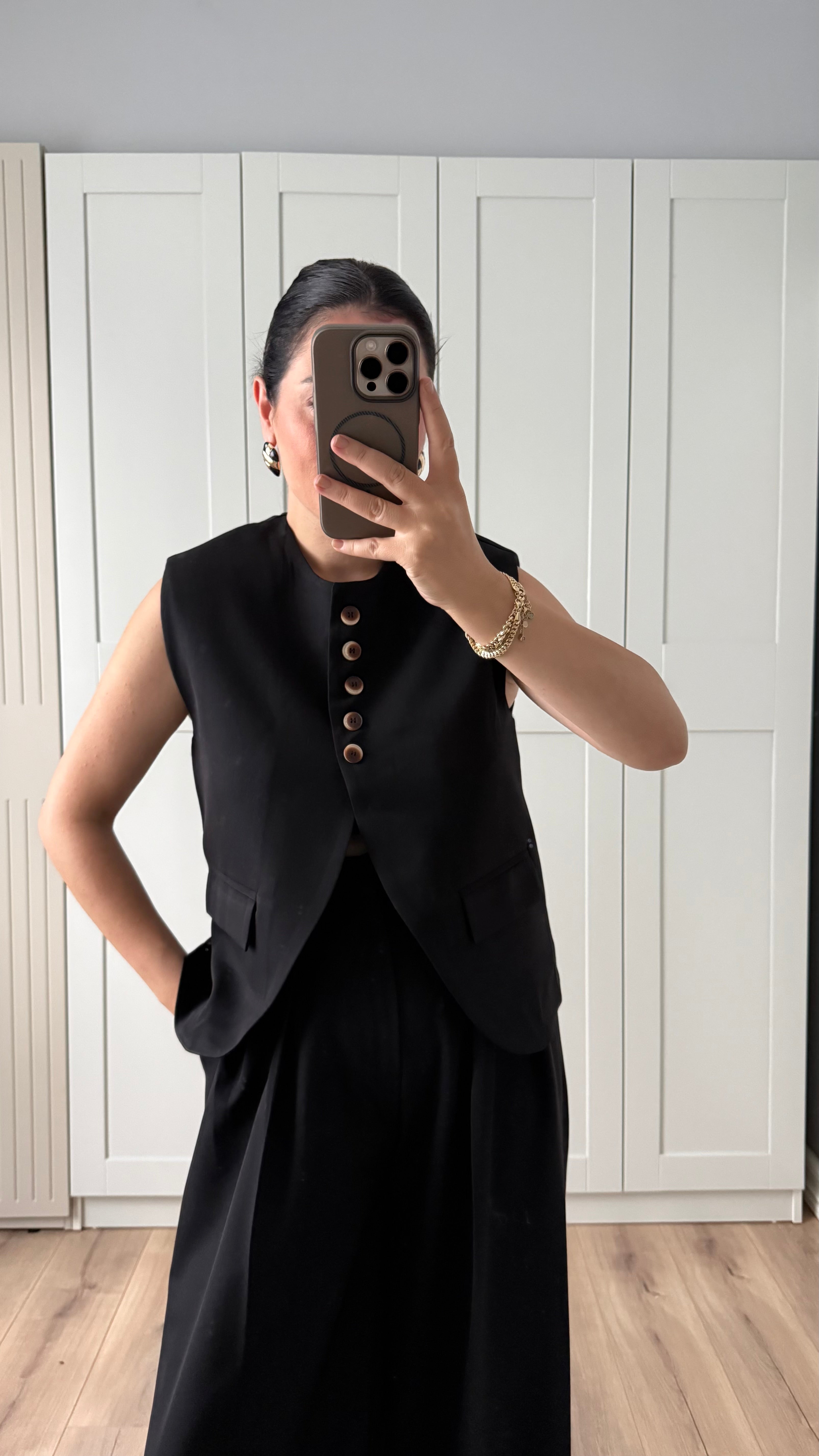 SİYAH VATKALI YELEK PALAZZO PANTOLON TAKIM